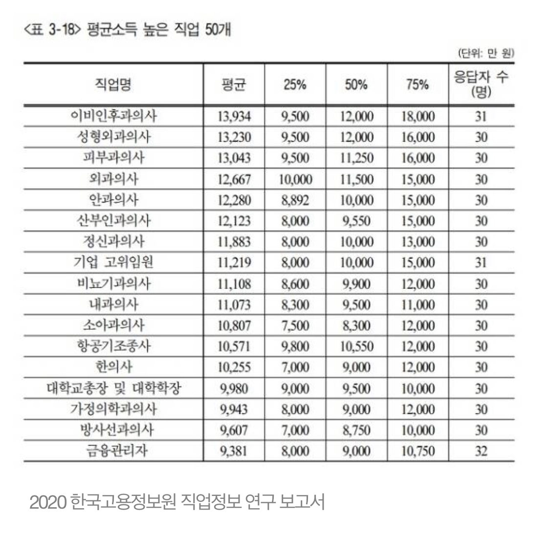 우리나라에서 가장 ‘돈 잘버는’ 직업은 바로 이비인후과 의사였습니다. 무려 연봉1위부터 7위까지가 모두 의사이고, 그 외에도 대부분이 의사가 상위권에 랭크하고 있어 역시 의사는 의사네… 라는 생각을 들게하네요