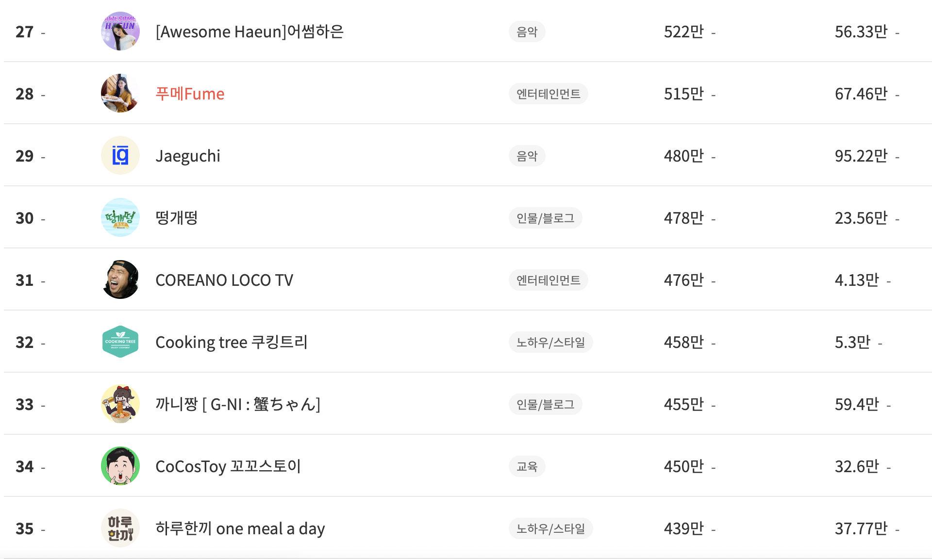 이번 유튜브 구독자 순위는 녹스인플루언서 웹사이트를 참고하였으며, 단체 및 연예인 유튜브는 최대한 제한하고 개인유튜버 위주로 순위를 가져와보았습니다.